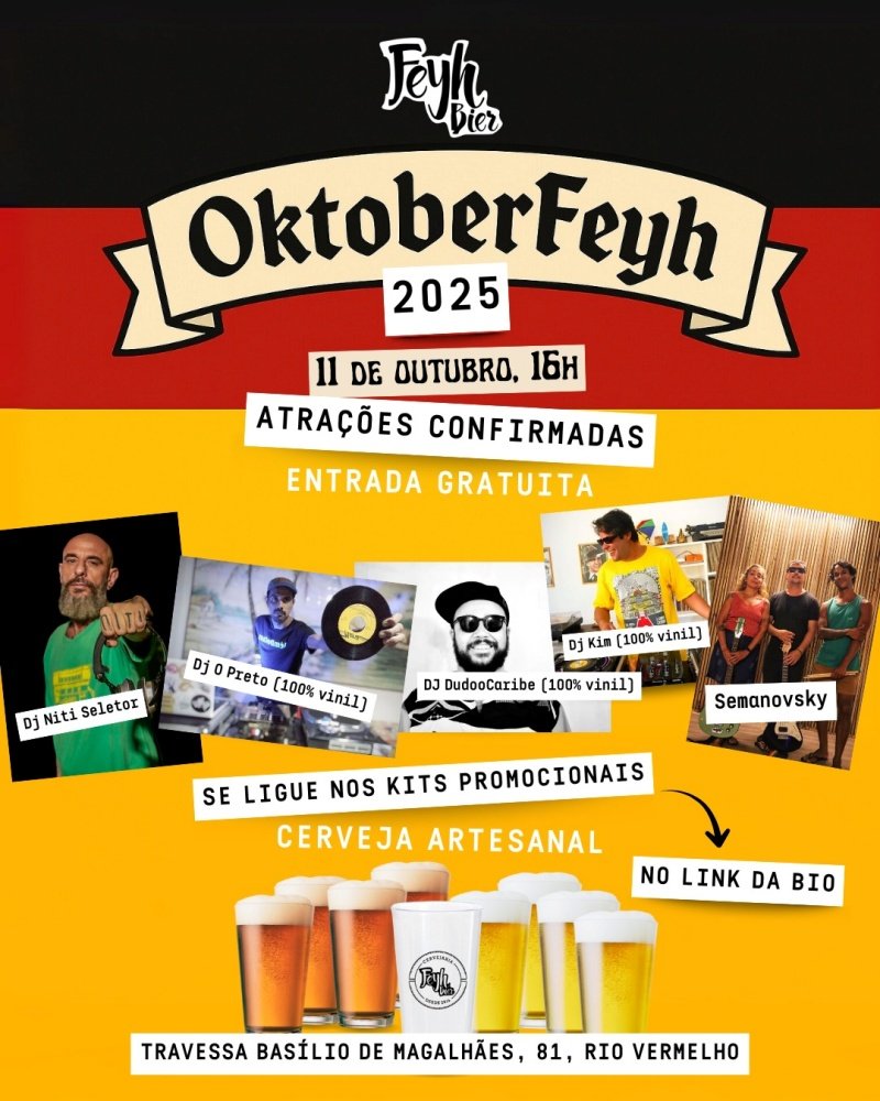 No próximo 11 de outubro de 2025, Salvador vai receber a primeira edição do OctoberFeyh, um evento inspirado na tradicional Oktoberfest, referência mundial na celebração da cultura cervejeira. A festa acontecerá em frente ao Feyh Bier Bar, no coração do Rio Vermelho, das 16h às 23h, com acesso gratuito.