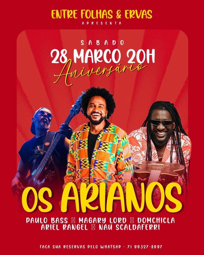 Sábado (28/03), às 20h, Os Arianos, formado por Magary Lord, Paulo Bass, Domchicla, Ariel Rangel e Nau Scaldaferri se apresentam no Entre Folhas e Ervas, localizado no Largo da Lapinha, 15 – Liberdade.