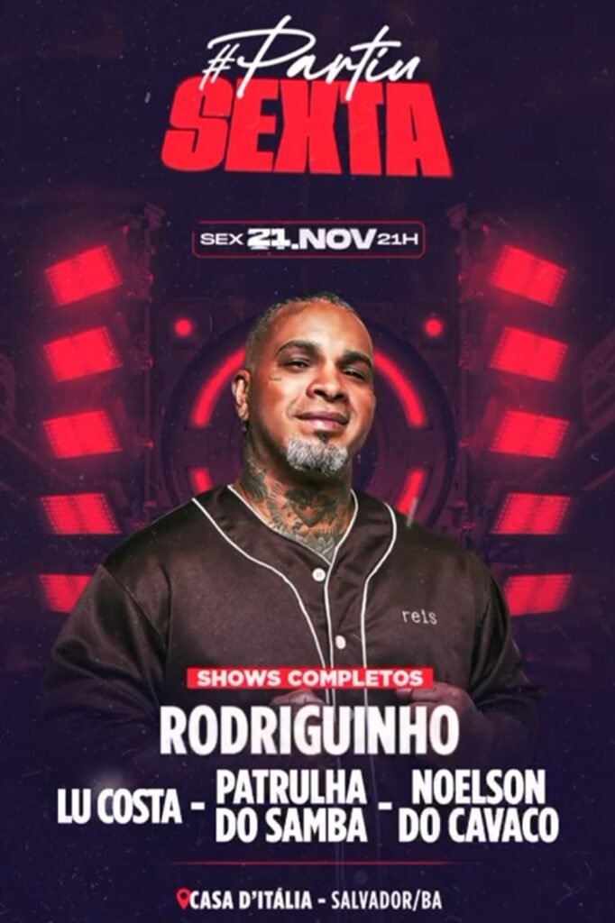A Casa D’Itália recebe nesta sexta-feira, 21 de novembro, às 21h, mais uma edição do projeto #PartiuSexta, trazendo para Salvador um dos maiores nomes do pagode nacional: Rodriguinho, que fará um show completo repleto de sucessos, romantismo e muito swing.