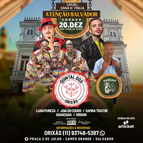 Sábado dia 20.12, o Quintal dos Orixás está de volta na Casa D’Itália, no Campo Grande, com apresentações especiais de Luan Pureza, Joia do Couro, Oganzada, Samba Trator e Orisun.