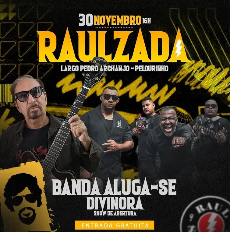 Dia 30.11, acontece mais uma edição do Raulzada, no Largo Pedro Arcanjo, Pelourinho, com as bandas Divinora e Aluga-se. Evento gratuito.
