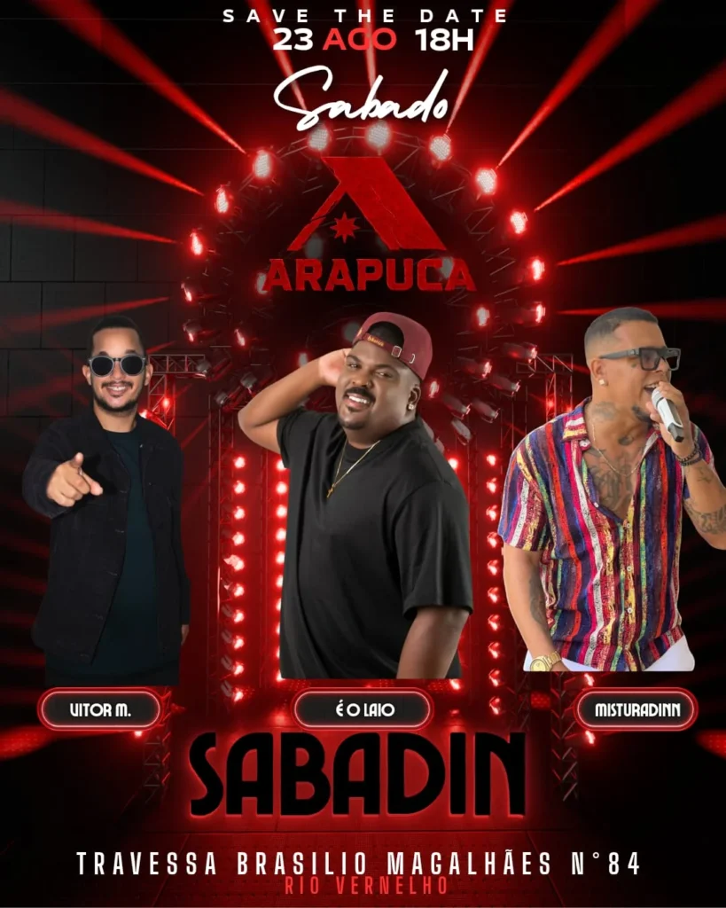 Sábado (23/08), às 18h, ocorre a festa Sabadin com apresentação de É o Laio, Vitor M. e Misturadinn no Arapuca, localizado na Travessa Basílio de Magalhães, 84 – Rio Vermelho. A festa marca a reinauguração do espaço.