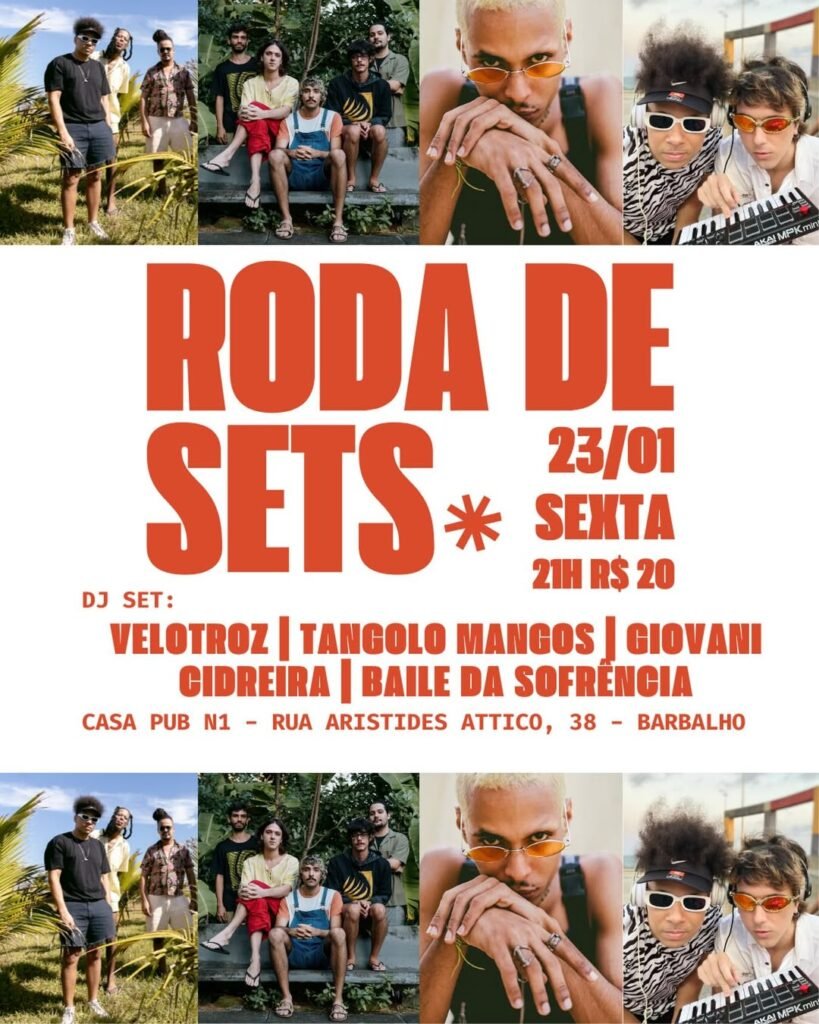 Sexta (23/01), às 21h, ocorre a festa Roda de Sets com DJ Sets de Velotroz, Tangolo Mangos, Giovani Cidreira e Baile da Sofrência no Pub Casa N°1, localizado na Rua Aristides Áttico, 38 – Barbalho.