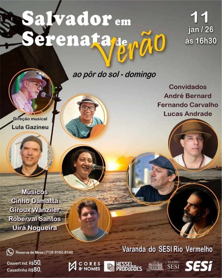 O verão em Salvador ganha um capítulo especial de poesia e música no domingo, 11 de janeiro de 2026, com a realização do Salvador em Serenata de Verão, a partir das 16h30, na Varanda do SESI Rio Vermelho. Emoldurado pelo pôr do sol e pela brisa do mar, o projeto convida o público para uma experiência sensorial única, onde a música brasileira se encontra com a delicadeza das serenatas.