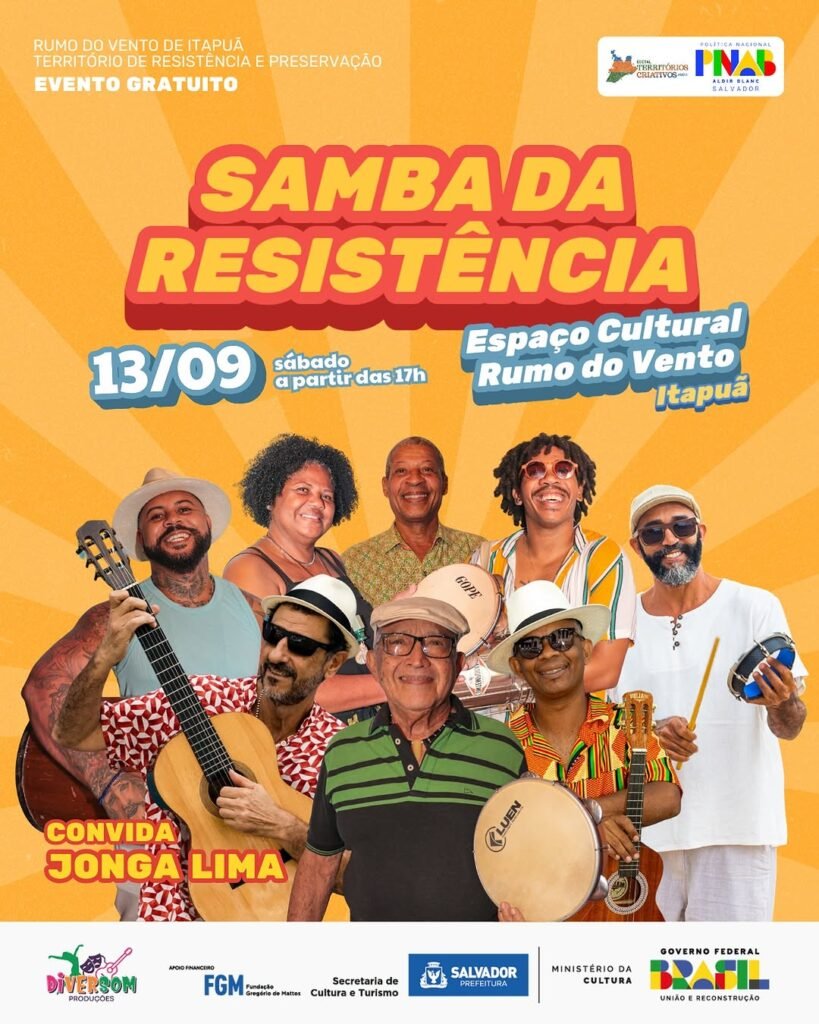 No sábado, dia 13 de setembro, a partir das 17h, Seu Regi de Itapuã reúne um time de bambas no Espaço Cultural Rumo do Vento, em Itapuã. A roda recebe o cantor e compositor Jonga Lima.