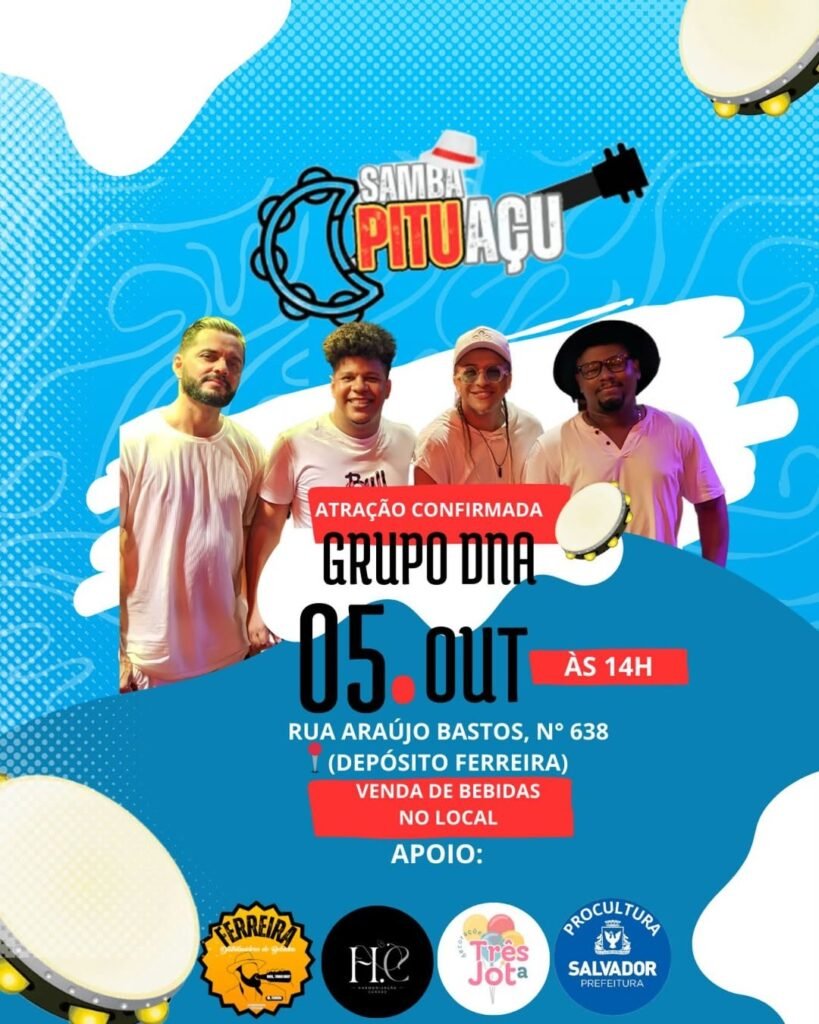 Domingo (05/10), às 14h, ocorre o Samba Pituaçu com apresentação do Grupo DNA no Depósito Ferreira, localizado na Rua Araújo Bastos, 638 – Pituaçu.