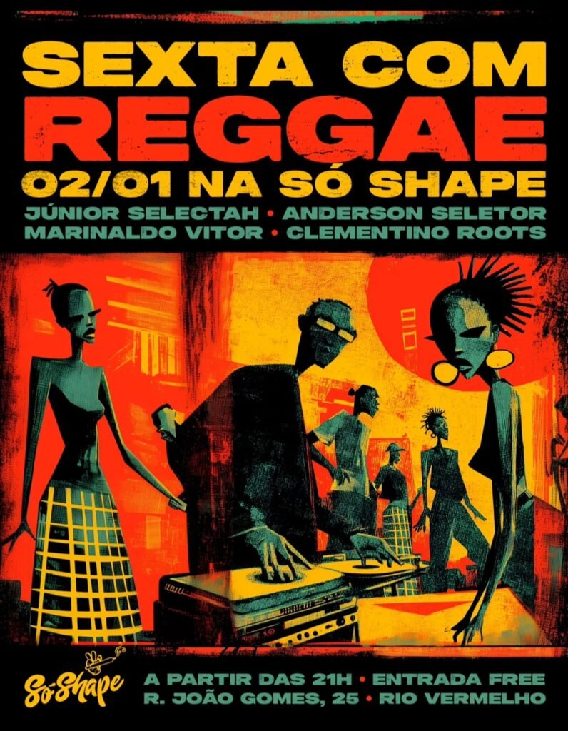 Nesta sexta, dia 2 de janeiro, a Só Shape, no Rio Vermelho, recebe a festa Sexta com Reggae, com Marinaldo, Junior Selecta, Anderson Seletor e Clementino Roots tocando o melhor do ritmo jamaicano a partir das 21 horas. A entrada é gratuita.
