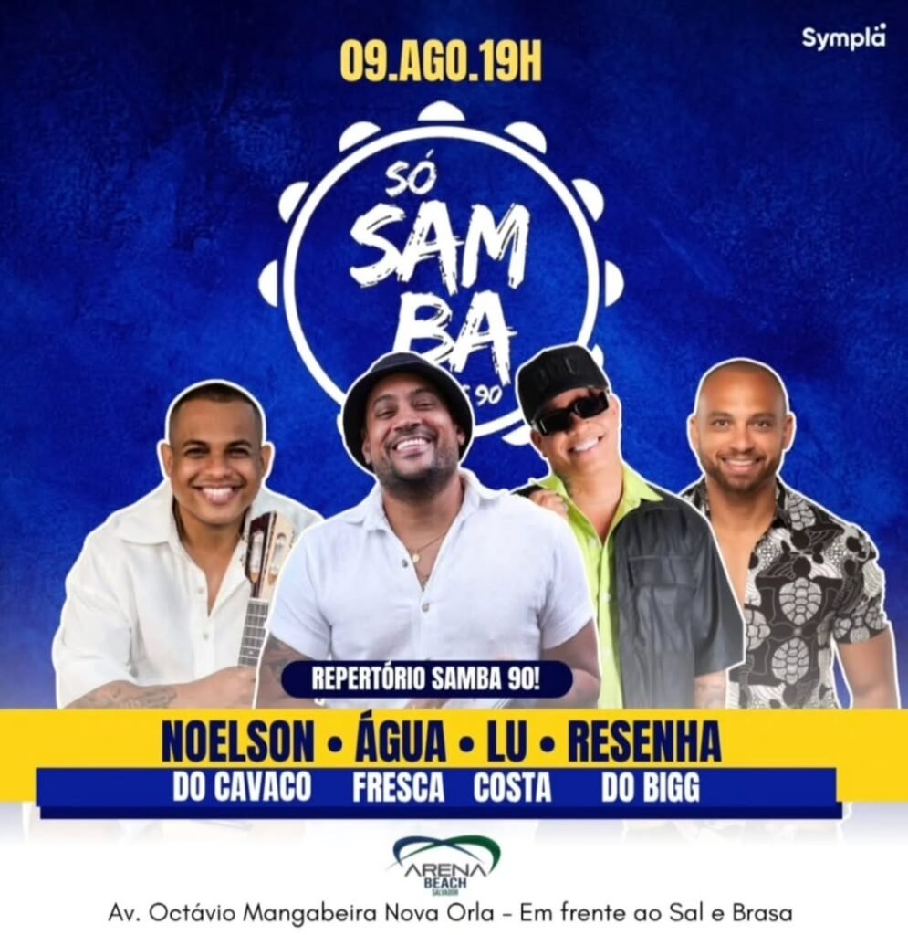 Sábado (09/08), às 19h, ocorre o Só Samba 90 com apresentação de Noelson do Cavaco, Água Fresca, Lu Costa e Resenha do Bigg na Arena Beach, localizada na Av. Octávio Mangabeira Nova Orla – Em frente ao Sol e Brasa – Pituaçu.