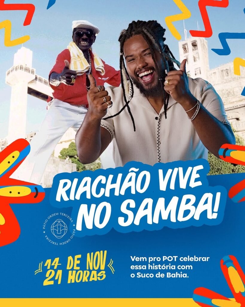Na sexta-feira, 14 de novembro, a partir das 21h, tem mais uma edição do Suco de Bahia, no Patio Ordem Terceira, com Taian Paim recebendo Bob na Voz, Samba Trator como convidados celebrando 104 anos de Riachão.
