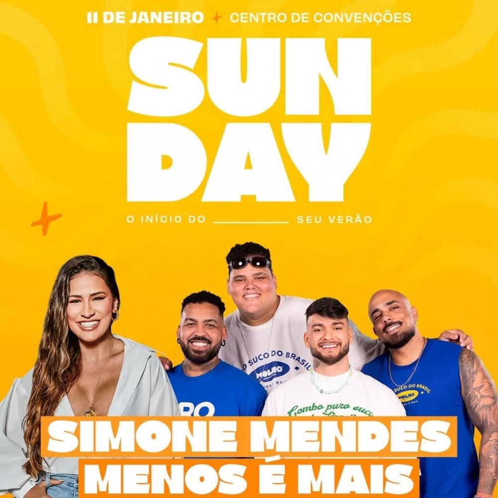 O grupo Menos é Mais e a cantora Simone Mendes são as atrações da primeira edição do Sunday Salvador, que chega com o auge do Verão à capital baiana, no próximo domingo, 11 de janeiro, no Centro de Convenções Salvador.
