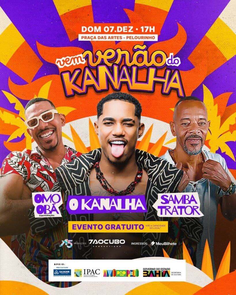 Neste domingo, 07 de dezembro, a partir das 17h, acontece o Vem Verão do Kanalha, que será realizado na Praça das Artes, no Pelourinho. A programação gratuita reúne três atrações que representam diferentes vertentes da música baiana contemporânea: O Kanalha, Omo Obá e Samba Trator.