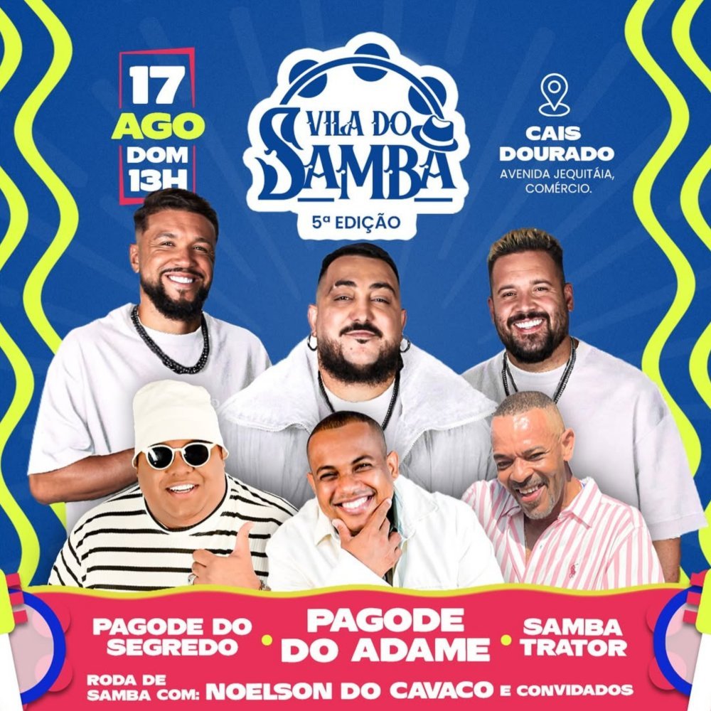 No dia 17 de agosto (domingo), a partir das 13h, o Cais Dourado, localizado na Avenida Jequitaia, no Comércio, será palco de mais uma edição da Vila do Samba. A 5ª edição do evento traz no line-up os grupos Pagode do Segredo, Pagode do Adame e Samba Trator, além de uma animada roda de samba com Noelson do Cavaco e convidados.