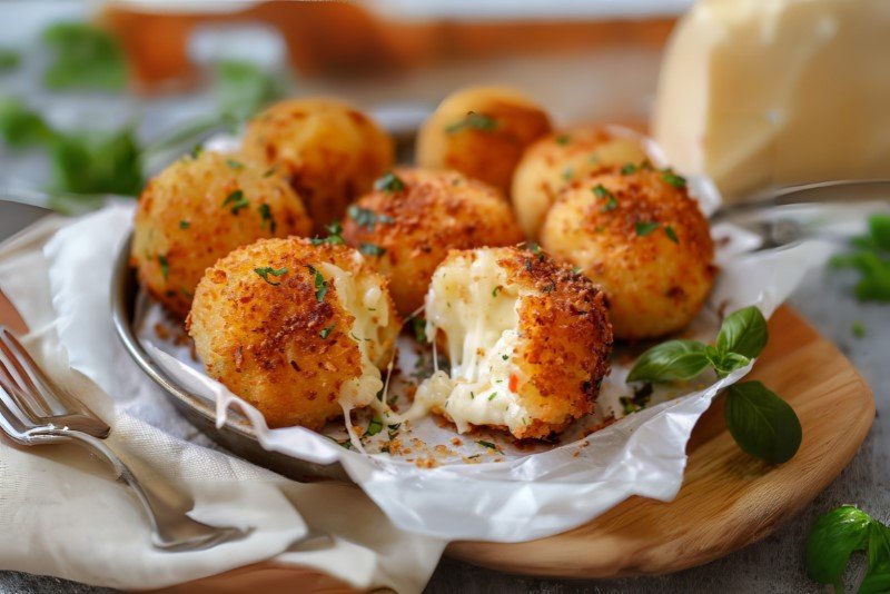 1.Com auxílio das mãos úmidas, pegue porções do risoto gelado e enrole em formato de bolinhas. Em seguida, faça um furo no meio e recheie com um pedacinho de queijo muçarela.