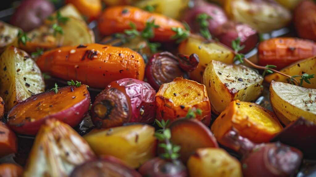 2.Leve para assar na Air Fryer, pré-aquecida a 180°C, por cerca 25 minutos ou até os legumes dourarem e estarem completamente cozidos.