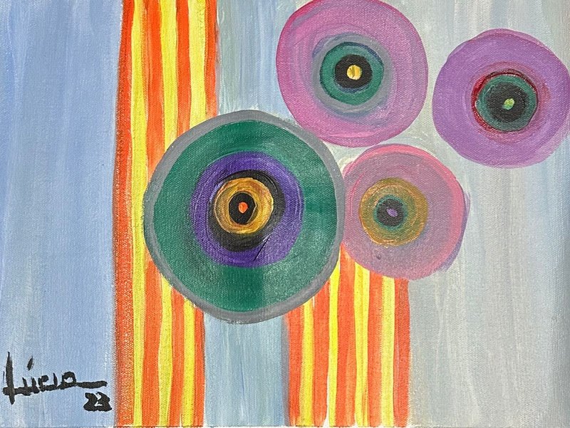 Já a segunda obra, apresenta um grafismo simples e límpido, com círculos coloridos, quase em tons aquarelados, regidos por três menores em combinações de rosas e violetas, e um maior com as complementações de cinza, verde, roxo, preto e amarelo. Alinhavando esses movimentos listras verticais excitadas pelo dueto do amarelo e alaranjado, pousam sob um fundo frio e leve em um degradê que vai do azul claro ao cinza.