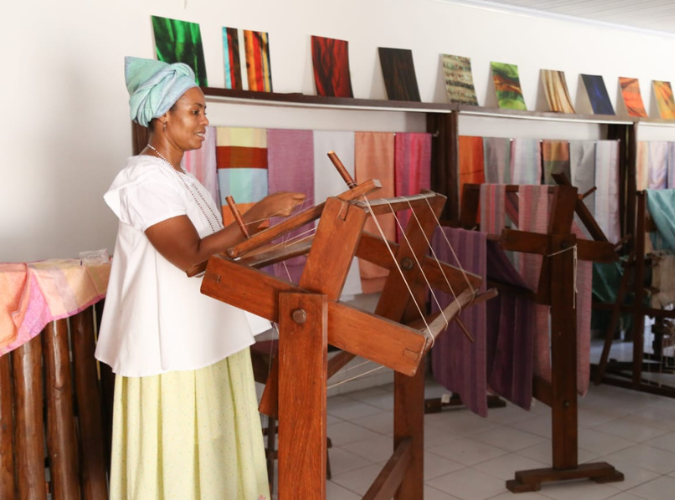 “Na África todos os africanos tinham pano-da-costa. Ao nascer a criança já ganha seu pano. porque o pano conta a história da vida dessa pessoa, cada processo de vida o indivíduo ganhava o tecido e ao falecer o tecido era enrolado no corpo dessa pessoa contando sua trajetória de vida”, relembra a tecelã da Casa de Alaká, Iraildes.