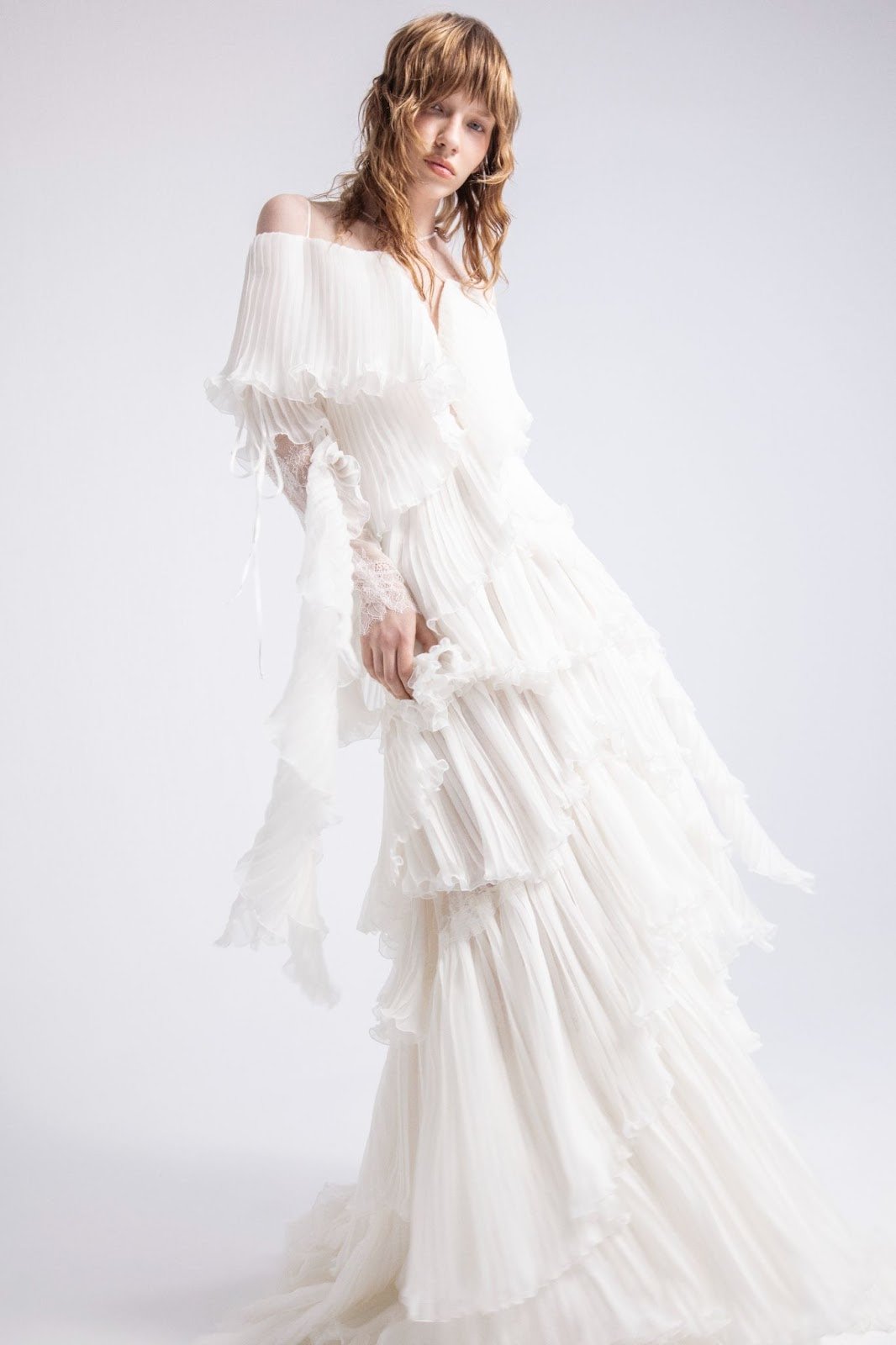 VB: Os babados estão de volta com força total. Esses detalhes podem ser incorporados no vestido de maneira romântica e sofisticada. Sugiro modelos que trazem um toque de leveza e movimento aos vestidos de noiva.