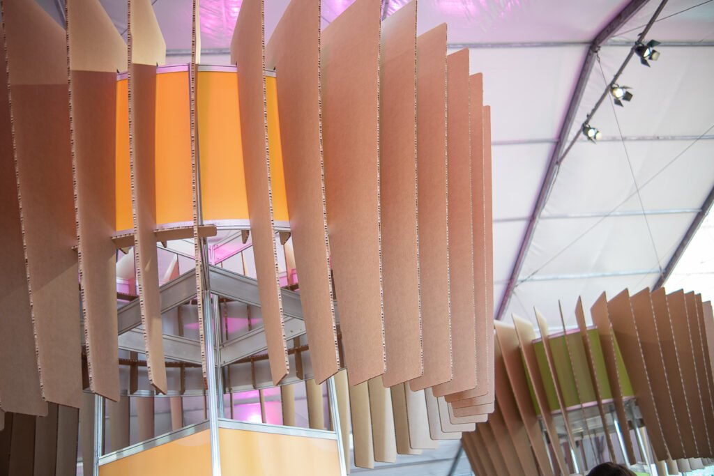 O projeto aposta no uso de materiais sustentáveis em espaços interativos e impactantes, reforçando o compromisso da empresa com o design inteligente, a versatilidade e a alta qualidade de impressão. Entre os destaques estão estruturas feitas a partir de placas de papel que sustentam a cenografia conhecidas como Ecoboard, material sustentável, leve e de alta performance, e chapas de compensado com impressão UV direta, substituindo os substratos utilizados nas últimas edições como vinil adesivo com tecnologia solvente e chapas plásticas.