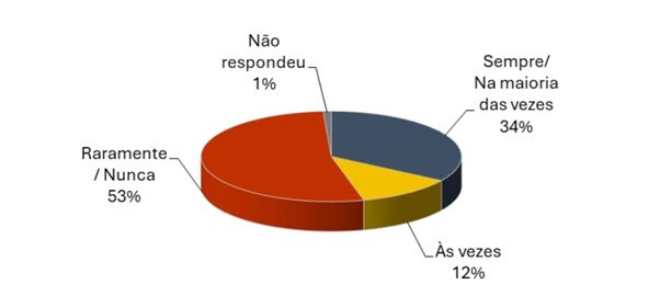 Apesar disso, entre quem costuma consumir bebida alcoólica (43%), pouco mais da metade (53%) afirma que raramente ou nunca verifica a procedência do produto no momento da compra, seja por meio da avaliação do selo, do rótulo, do registro, do lacre ou da origem da bebida. Por outro lado, 34% dizem verificar sempre ou na maioria das vezes e 12% somente às vezes.