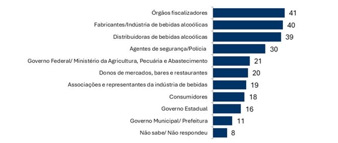 Na opinião dos brasileiros, os principais responsáveis por evitar que bebidas alcoólicas adulteradas com metanol cheguem ao consumidor são os órgãos fiscalizadores (41%), indicados de forma mais significativa entre os mais escolarizados e por aqueles com maior renda familiar. Em patamar muito próximo, aparecem em seguida os fabricantes/indústria de bebidas alcoólicas (40%) e as distribuidoras de bebidas alcoólicas (39%).