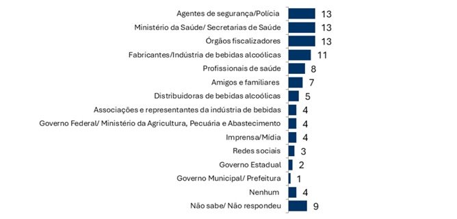 Quanto às fontes de informação mais confiáveis sobre consumo seguro, destacam-se agentes de segurança/Polícia, órgãos fiscalizadores, Ministério da Saúde/secretarias de saúde (13%, cada) e fabricantes/indústria de bebidas alcoólicas (11%).