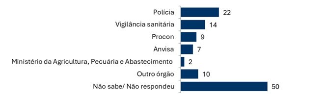 Metade da população não sabe mencionar para qual órgão uma pessoa pode denunciar uma suspeita de adulteração de bebidas alcoólicas. Entre as menções apontadas espontaneamente, a Polícia aparece em primeiro lugar (22%), seguida pela Vigilância Sanitária (14%).