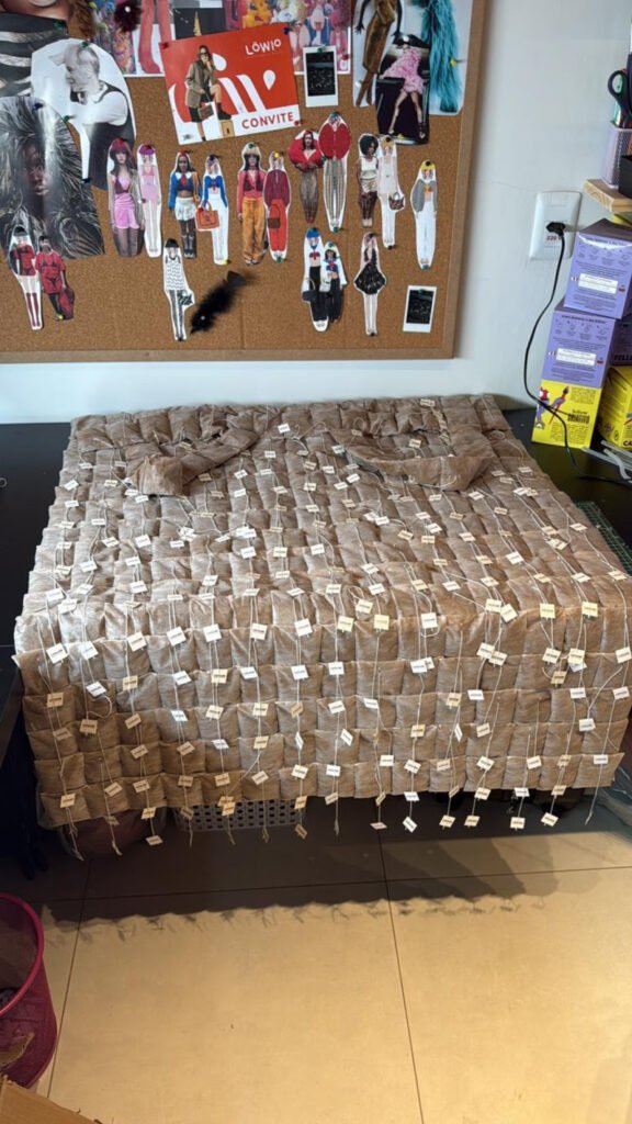 Cada sachê foi costurado e colado manualmente, um a um, em um processo minucioso e quase ritualístico, um verdadeiro trabalho feito à mão, sob medida, que dialoga com o movimento contemporâneo da moda, que valoriza o artesanal, o tempo, o toque humano e a exclusividade.