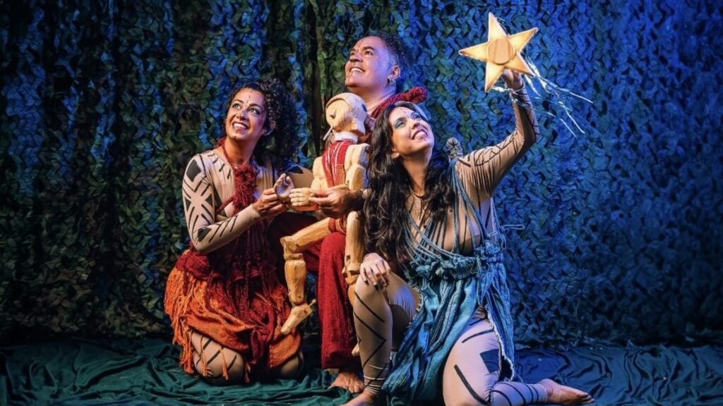 No dia 17 de outubro, o público é convidado a mergulhar na fábula de “Embaixo do Céu”, espetáculo infantojuvenil inspirado em um conto do povo Xavante. A história acompanha um Wapté (adolescente) que se apaixona por uma estrela, conduzindo crianças, jovens e adultos por uma narrativa de transformação e pertencimento. Criada com as linguagens do teatro de formas animadas — objetos, bonecos e máscaras — e com trilha sonora executada ao vivo pelos próprios artistas, a montagem combina sensibilidade e imaginação em cena, aliando teatro e oralidade indígena.