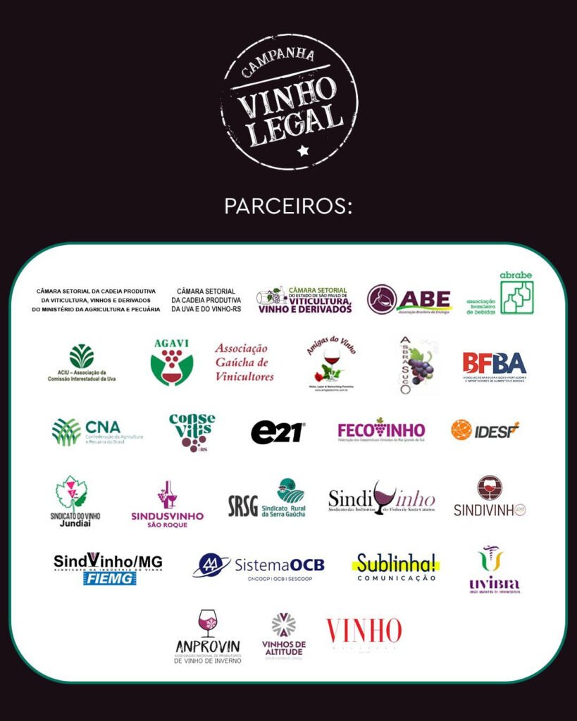 A campanha Vinho Legal conta com a participação da Câmara Setorial de Viticultura, Vinhos e Derivados, vinculada ao Ministério da Agricultura e Pecuária (Mapa); da Câmara Setorial da Cadeia Produtiva da Uva e do Vinho do Rio Grande do Sul; da Câmara Setorial Viticultura, Vinhos e Derivados de São Paulo; do Sindicato da Indústria do Vinho do Estado do Rio Grande do Sul (Sindivinho-RS); do Sindicato da Indústria do Vinho de Minas Gerais (Sindvinho-MG); do Sindicato da Indústria do Vinho de São Roque (Sindusvinho São Roque-SP); do Sindicato das Indústrias do Vinho de Jundiaí (Sindivinho Jundiaí-SP); do Sindicato das Indústrias do Vinho de Santa Catarina (Sindivinho-SC); da Associação Brasileira de Enologia (ABE); da Associação Brasileira das Indústrias de Suco de Uva (Asbrasucos); da Associação Brasileira dos Exportadores e Importadores de Alimentos e Bebidas (BFBA); da Associação Brasileira de Bebidas (Abrabe); das entidades que compõem o Instituto de Gestão, Planejamento e Desenvolvimento da Vitivinicultura do Estado do Rio Grande do Sul (Consevitis-RS): União Brasileira de Vitivinicultura (Uvibra), Associação Gaúcha de Vinicultores (Agavi), Federação das Cooperativas Vitivinícolas do Rio Grande do Sul (Fecovinho) e Associação Comissão Interestadual da Uva (ACIU); da Federação das Indústrias de Minas Gerais (FIEMG); Confederação da Agricultura e Pecuária do Brasil (CNA); da da Organização das Cooperativas Brasileiras (OCB); da Vinhos de Altitude Produtores e Associados (SC), da Associação Nacional de Produtores de Vinhos de Inverno (Anprovin), do Sindicato Rural da Serra Gaúcha (SRSG) do Instituto de Desenvolvimento Econômico e Social de Fronteiras (Idesf), Vinho Magazine e Sublinha! Comunicação, da E21 – Agência de Multicomunicação, e de outras entidades representativas do setor e dos consumidores.