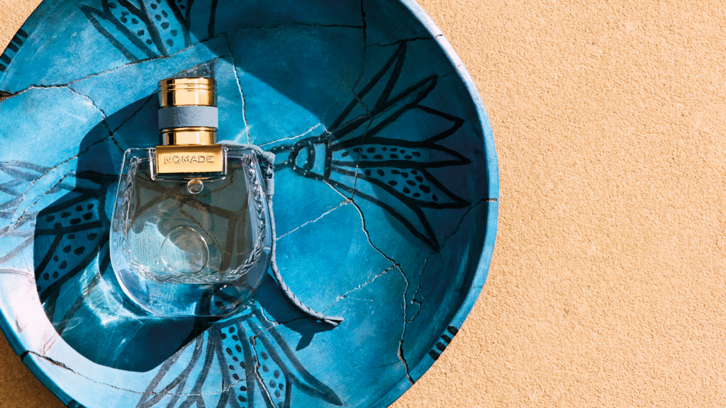 Chloé Nomade Lumière d’Égypte é apresentada no icônico frasco da linha, enquanto o nó atado ao seu pescoço ganha um novo tom de azul crepuscular. Para as imagens da campanha, o frasco foi fotografado diante de um cenário de pratos de cerâmica marcados pelo tempo, no estilo das peças da antiguidade, esmaltados em um profundo azul mediterrâneo e adornados com flores de lótus pintadas.