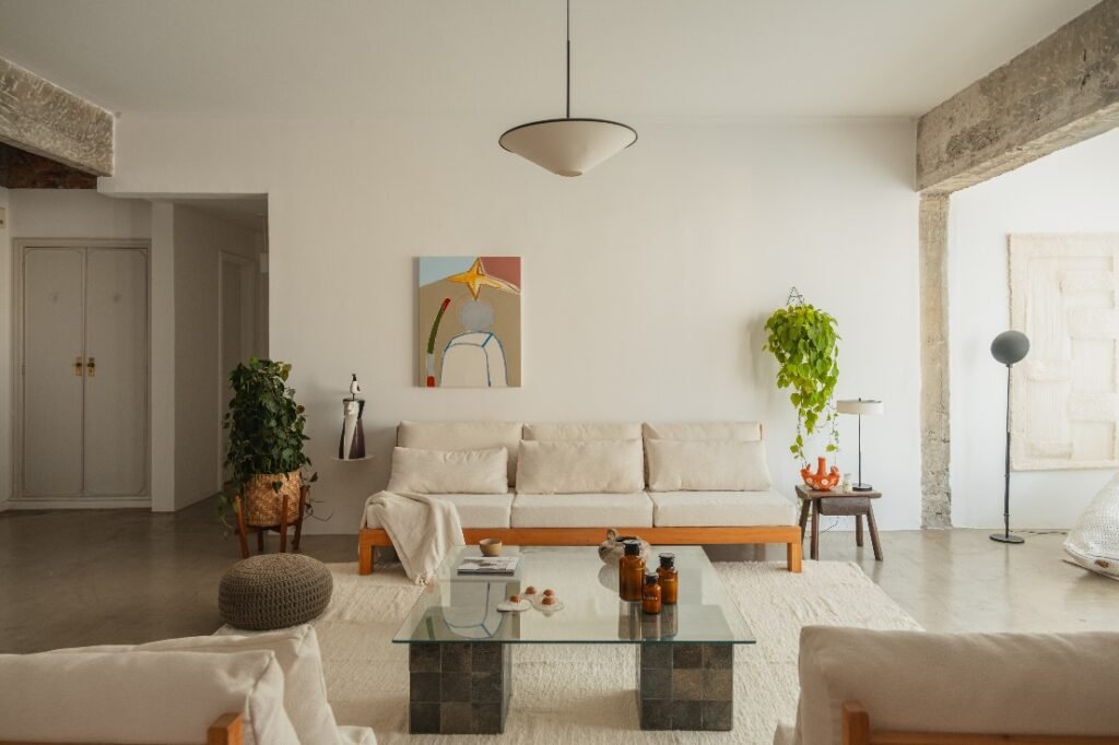A sala de estar acima é um exemplo claro desse conceito. Com as paredes pintadas na Cor Branco Neve, o ambiente transmite uma sensação de leveza, silêncio e equilíbrio. A cor cria uma base neutra que valoriza a entrada de luz natural e destaca os elementos de decoração, como madeira clara, objetos artesanais e plantas. O resultado é uma sala serena e convidativa, ideal para momentos de pausa e reconexão.