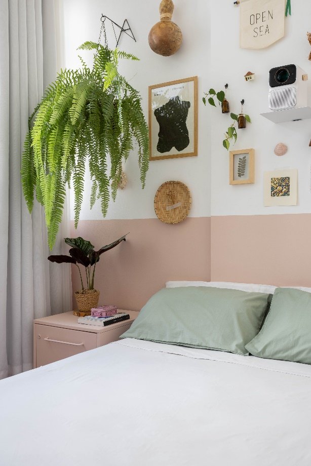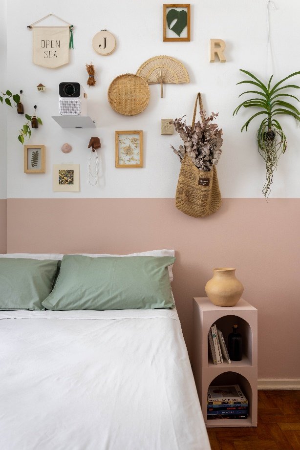 Outro exemplo de suavidade é o quarto abaixo, que utiliza a Cor Duna na meia parede, em contraste com o branco na parte superior. O tom rosado, suave e acolhedor, reforça a atmosfera de descanso e afeto, ideal para ambientes íntimos. A composição ganha ainda mais delicadeza com elementos naturais, como plantas, objetos artesanais e tecidos leves, criando um espaço que convida ao autocuidado e ao relaxamento.