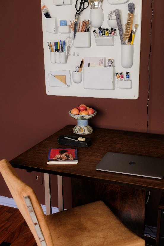 Esse escritório, além de imprimir personalidade, mostra como tons mais escuros podem criar um ambiente de trabalho acolhedor e focado. Combinados a móveis de madeira e luz pontual, eles reduzem estímulos visuais e favorecem a concentração. “Cores profundas ajudam a criar uma atmosfera de presença e foco, ideal para atividades criativas ou analíticas”, finaliza a dupla.