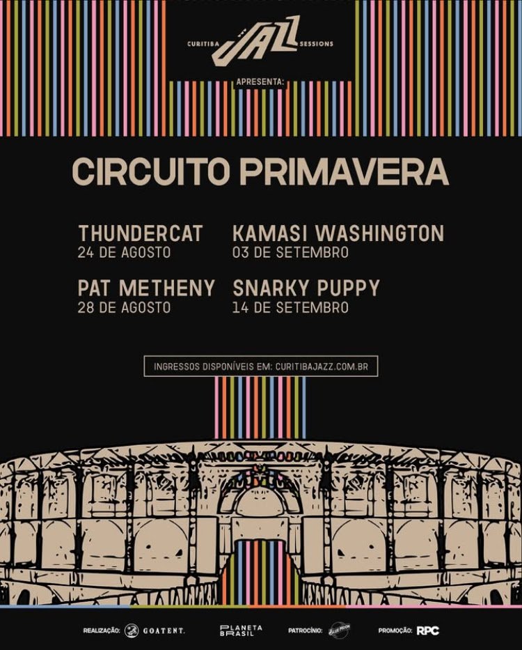 O Circuito Primavera de Jazz reúne quatro dos nomes mais influentes da música instrumental contemporânea. Pat Metheny, lenda viva do jazz, é conhecido por sua sonoridade inovadora que atravessa gêneros e já lhe rendeu 20 Grammys em 10 categorias diferentes. Kamasi Washington, um dos principais expoentes do novo jazz norte-americano, combina espiritualidade, potência e política em composições épicas e orquestrais. Thundercat, multi-instrumentista virtuoso e parceiro de nomes como Kendrick Lamar e Flying Lotus, transita com irreverência entre o jazz, o funk e o R&B. Já o coletivo Snarky Puppy, ganhador de vários Grammys, é aclamado por sua fusão energética de jazz, rock, soul e música do mundo, com performances ao vivo que são verdadeiros espetáculos de improviso e precisão. Juntos, esses quatro artistas formam um line-up histórico para a cena musical brasileira. A venda de ingressos para o Circuito Primavera de Jazz estão abertas no site oficial do evento: www.curitibajazz.com.br. Todos os shows serão na Ópera de Arame (Rua João Gava, 920), a partir das 19h. Mais informações no perfil oficial do Curitiba Jazz Sessions no Instagram: @curitibajazzsessions.