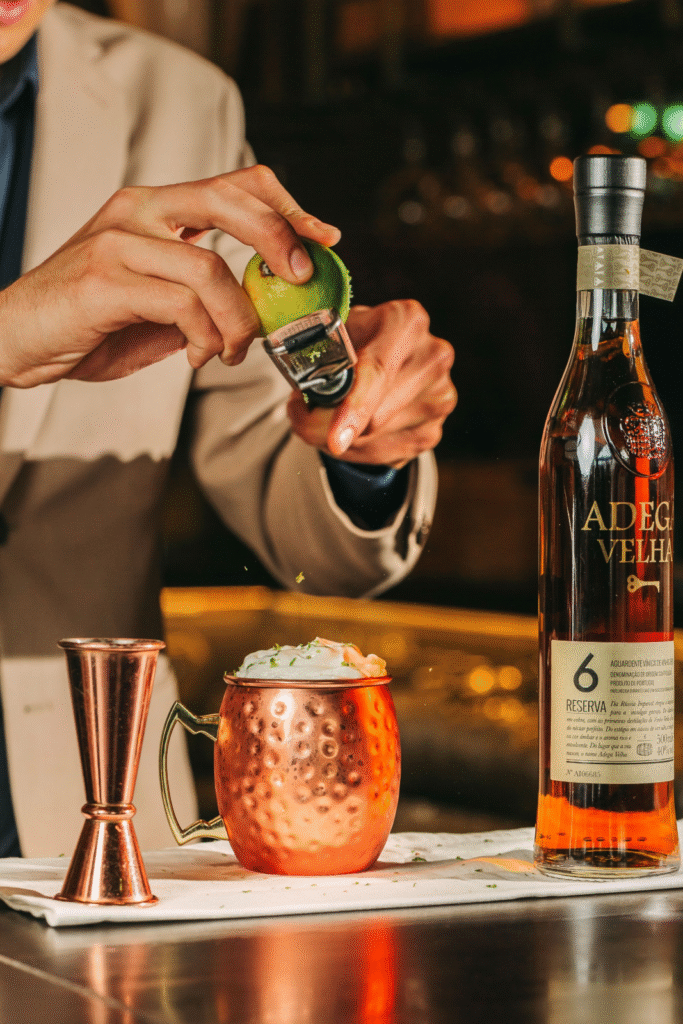 Juntar em um copo 50 ml de Adega Velha 6 anos. Adicionar 3 cubos de gelo, 25 ml de suco de limão e 200 ml de Ginger Beer. Por fim, decorar com uma rodela de limão e folha de hortelã.