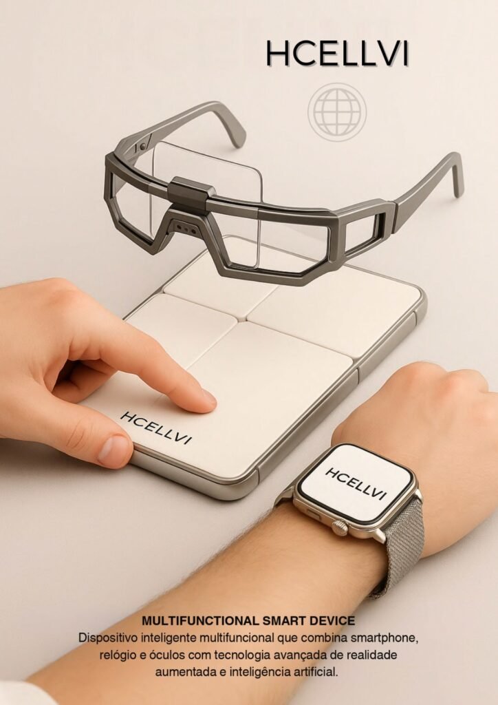 Apresentado como o primeiro dispositivo 3-em-1 do mercado, o Hcellvi combina smartphone dobrável, smartwatch e óculos inteligentes em um ecossistema totalmente conectado, com design sofisticado, recursos de realidade aumentada, inteligência artificial de ponta e compromisso com a sustentabilidade neutra em carbono.