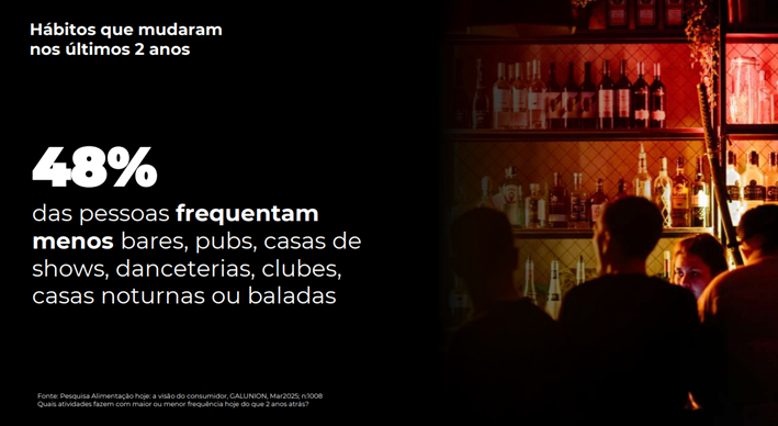 Outra mudança perceptível é a diminuição no consumo de bebidas alcoólicas. Especialmente entre os jovens adultos, há uma tendência crescente de reduzir ou até eliminar o álcool da rotina. As motivações variam desde saúde física e mental a uma importância ao estado de presença e conexão, e contenção de gastos. A indústria, atenta a esse movimento, tem investido em bebidas não alcoólicas com design e sabor sofisticados, como os chamados “mocktails” e cervejas sem álcool. “Nossa pesquisa mostra que, diante deste cenário, 48% das pessoas frequentam menos bares, pubs, casas de shows, danceterias, clubes, casas noturnas ou baladas. Vimos também um recente movimento global de experiência diurnas movidas a bebidas não alcoólicas, como as coffee parties, com festas com DJ e música, em cafeterias, que ocorrem durante o dia”, explica.