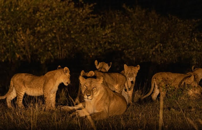 Ao entardecer, o ar esfria, os sons mudam e a vida selvagem, antes adormecida pelo calor do dia, desperta com uma energia silenciosa, porém intensa. Os safáris noturnos no Mahali Mzuri permitem testemunhar esse outro ecossistema: hienas caçando em matilha, leopardos à espreita, corujas em voo, leões e seus filhotes descansando após um dia de caçada. A escuridão, acompanhada por guias Maasai que leem a terra como um livro aberto, torna-se uma aliada da experiência.