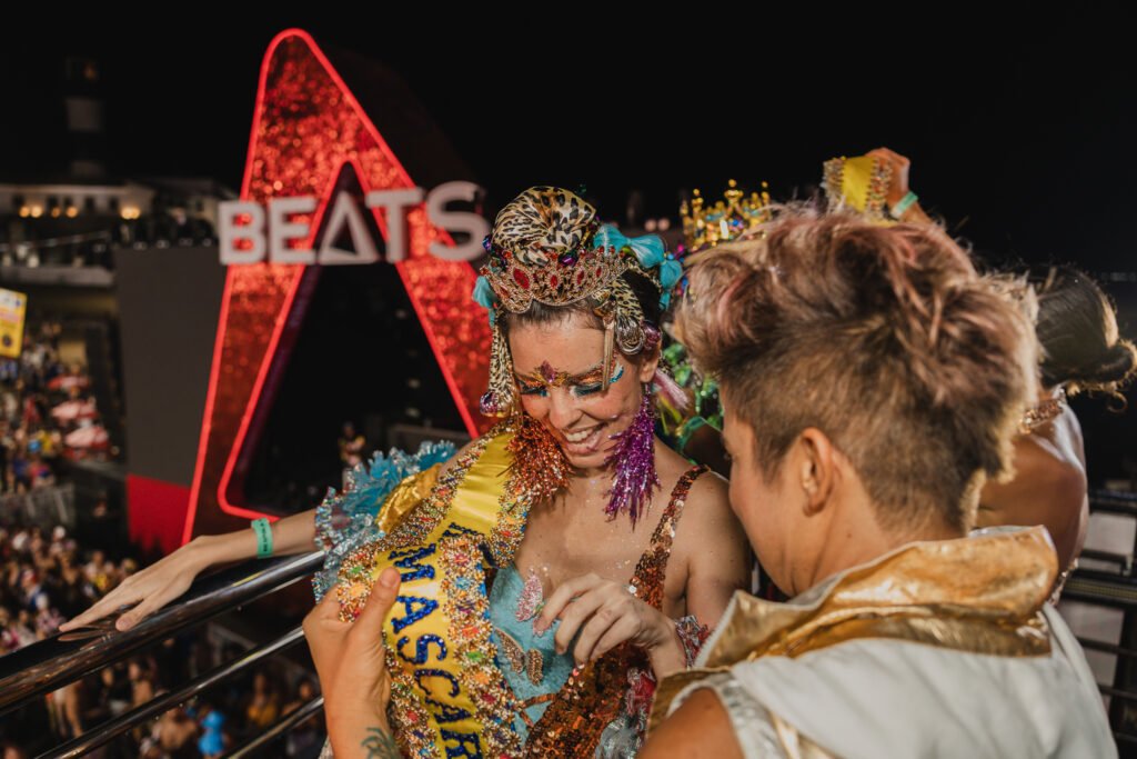 O bloco mais plural, colorido e alegre da cidade, Os Mascarados atraiu mais de 15 mil foliões fantasiados, ontem (27/02), no primeiro dia oficial de Carnaval, no Circuito Barra-Ondina. Sob o comando do cantor Tatau e a participação de Margareth Menezes, homenageada pelo bloco, os foliões se divertiram com um repertório com músicas que marcam os 40 Anos de Axé Music e os 75 Anos de Trio Elétrico. No Farol da Barra, o público aplaudiu a cerimônia de coroação do rei Bem Gil e da rainha Mãeana, que trazem recordações do bloco no início do namoro.