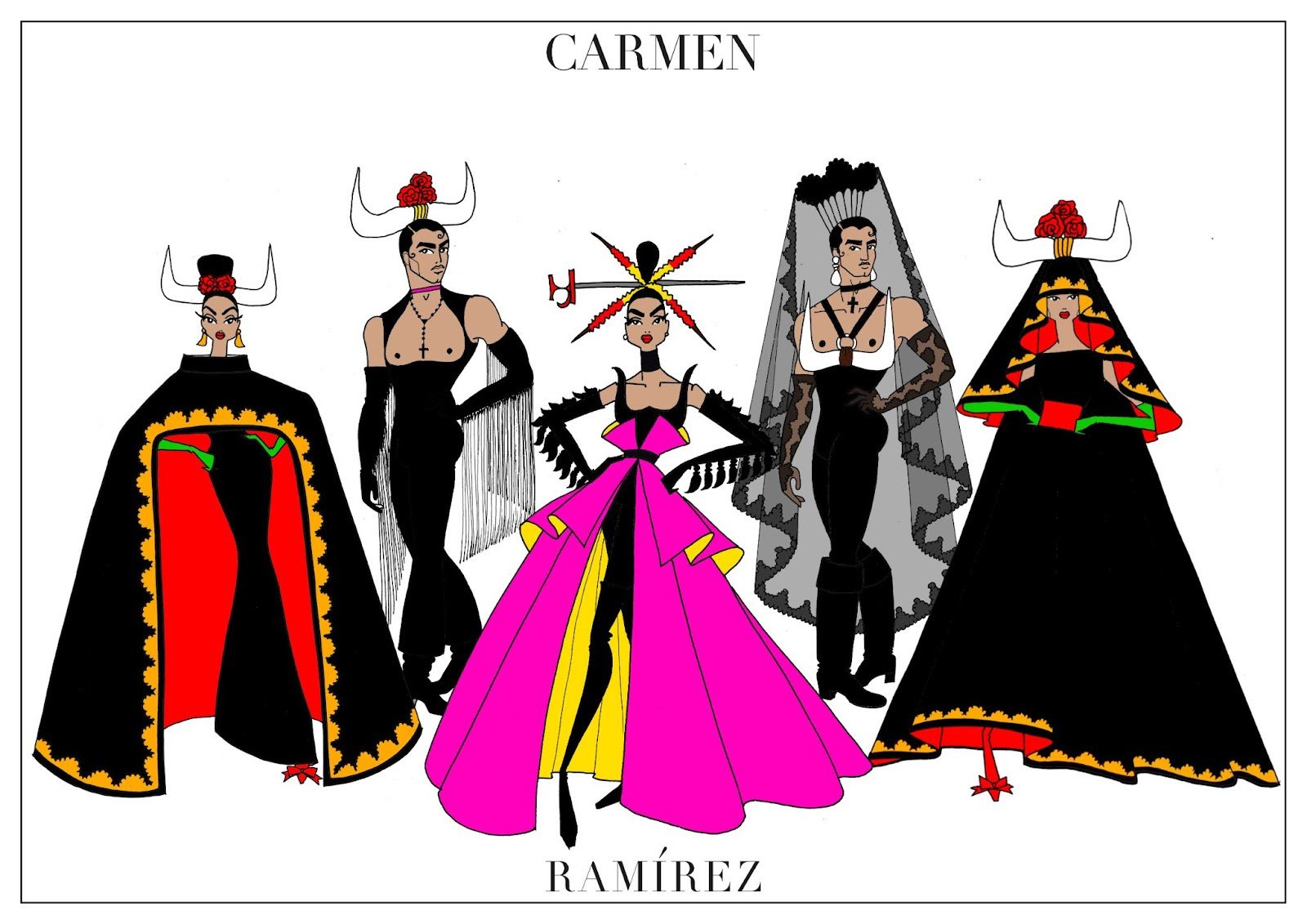 Desfilam no palco cantores e atores vestindo centenas de figurinos desenhados especialmente pelo estilista argentino Pablo Ramírez, responsável pela coleção desfilada no Teatro Colón em 2012 que deu a inspiração inicial para a parceria dele com Takla. Na ocasião, Ramírez, que o conheceu por intermédio de Nicolás Boni para uma montagem de Tosca, apresentou sua coleção que trazia diversas Carmens: uma mais sofisticada, uma mais cigana, uma mais ligada ao universo de Lorca, outra mais dramática, e, assim, Takla decidiu que esse era o título que deveriam eleger para seu projeto. Com o projeto adiado em função da pandemia, Ramírez se animou e desenhou todos os modelos inéditos.