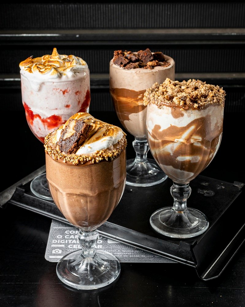Para acompanhar, nada melhor do que a nova linha de milkshakes da casa, com opções como shake de morango com merengue gratinado, shake de chocolate com pedaços de castanha e borda de nutella, shake de nutella com pedaços de brownie, e shake de ninho finalizado com nutella e farofa de cookies.