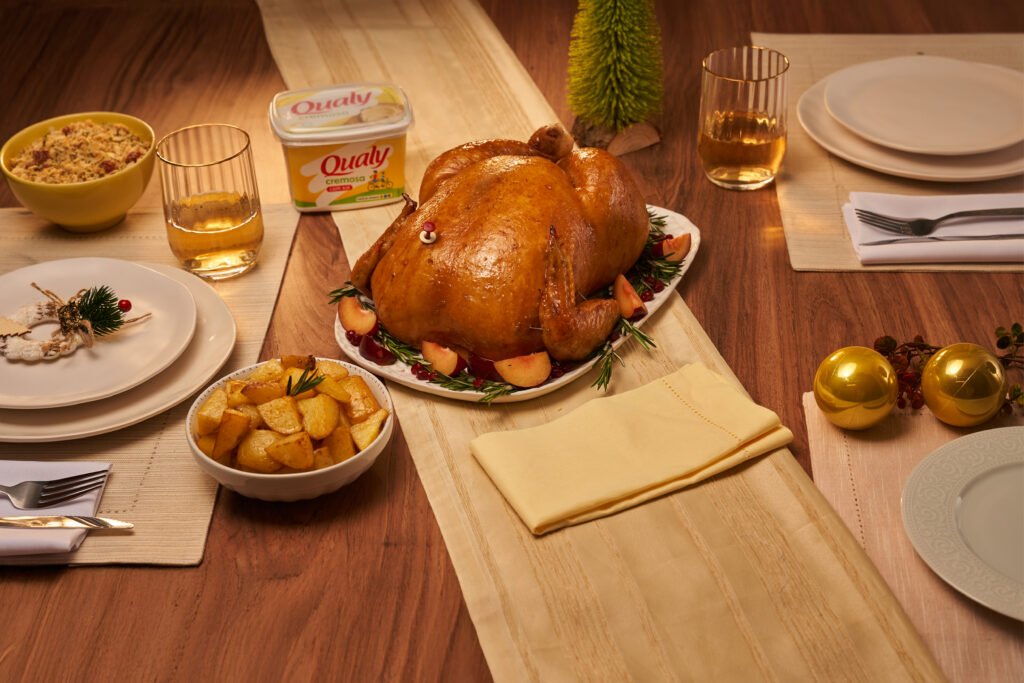 - Acomode a ave em uma assadeira média com pelo menos 5 cm de altura e besunte-a com metade da Qualy Cremosa Com Sal. Esfregue na ave, para que pegue o tempero, o alho picado, a páprica defumada, sal e pimenta-do-reino a gosto. Despeje sobre a ave a cerveja preta e cubra com papel-alumínio para evitar que resseque.