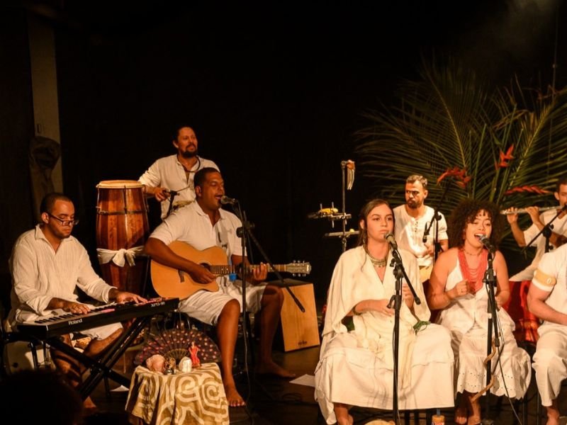 No palco, os artistas Benin (voz), Johnnys (voz, violão e direção artística), Lorena Lélis (voz), Juju Macêdo (voz, pandeiro e ukulele), Jorge Galvão (voz, capoeira e percussão regional), Silas Silva (teclados) e Duda Rathobare (flauta transversal, percussão e maracá) conduzem o público por uma jornada que mistura Candomblé, Santo Daime, misticismo cristão e práticas indígenas, evocando o sagrado em forma de som e movimento.