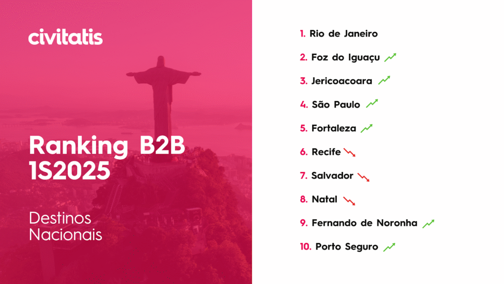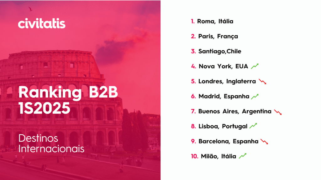 Entre janeiro e junho deste ano, Roma liderou o ranking das reservas no canal B2B, seguida por Paris e Santiago, mesmo top 3 do ranking de 2024. Na sequência aparece Nova Iorque, que subiu quatro posições em relação a 2024, e Londres, que caiu uma posição.