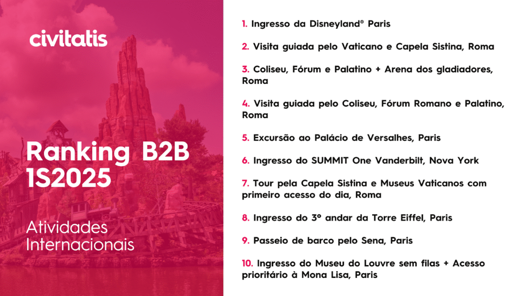 Entre as atividades internacionais mais reservadas no canal B2B estão entradas para parques de diversões e atrações icônicas, como a Disneyland® Paris, o SUMMIT One Vanderbilt e a Torre Eiffel. Também se destacam visitas guiadas a pontos históricos e culturais europeus, como o Vaticano, a Capela Sistina, o Coliseu, o Museu do Louvre e o Palácio de Versalhes.