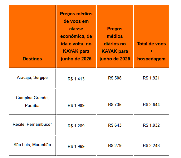 Com base em pesquisas realizadas no KAYAK.com.br e seus sites associados para voos de todos os aeroportos do Brasil, para os aeroportos de Campina Grande, São Luís, Aracaju e Fortaleza no período de 16/10/2024 a 16/04/2025 para viagens entre 30/05/2025 e 30/06/2025. Os preços médios são para voos de ida e volta, em classe económica para 1 pessoa e podem variar com o tempo.