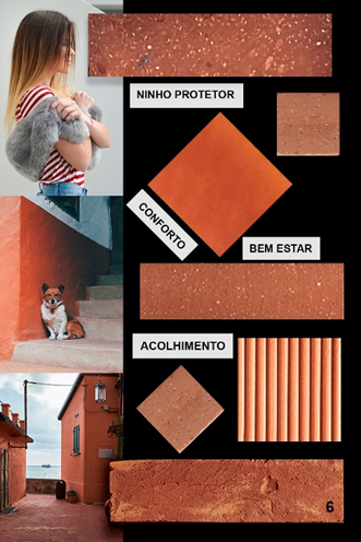 Revestimentos e mobiliários começam a ter esta preocupação primordial de transmitir a sensação de conforto. As tonalidades quentes, como por exemplo o grupo de Terracotas, passam a ser as queridinhas do momento.