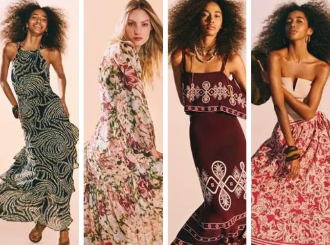 A cartela de cores mistura tons vibrantes e suaves, refletindo a luz e o clima da estação, enquanto as estampas florais, geométricas e abstratas, dão personalidade a cada vestido. Usados com sandálias ou tênis, funcionam para o dia a dia; combinados com saltos e acessórios, ganham elegância para a noite.