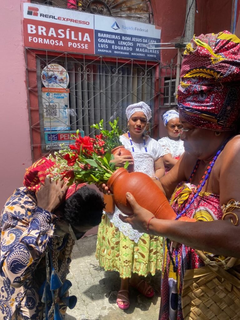O cortejo seguiu pelas ruas do Centro Histórico carregado de simbolismo, música, cânticos e energia, até chegar ao Mercado de Santa Bárbara, onde acontece a lavagem da gruta — um ritual de purificação, fortalecimento espiritual e renovação. Durante a celebração, houve ainda uma homenagem especial ao Acará, o “bolinho de fogo” de Iansã, Orixá dos ventos, dos raios e da transformação. A referência reforça a força, a coragem e o movimento que caracterizam essa divindade tão presente no imaginário e na devoção do povo baiano.